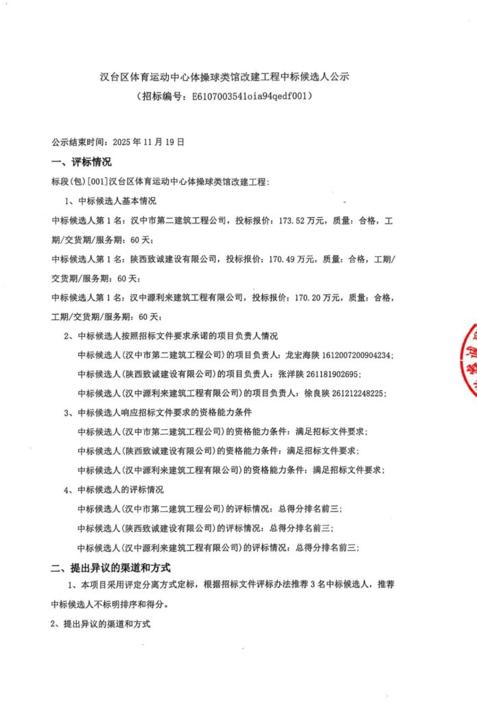 汉台区体育运动中心体操球类馆改建工程中标候选人公示
